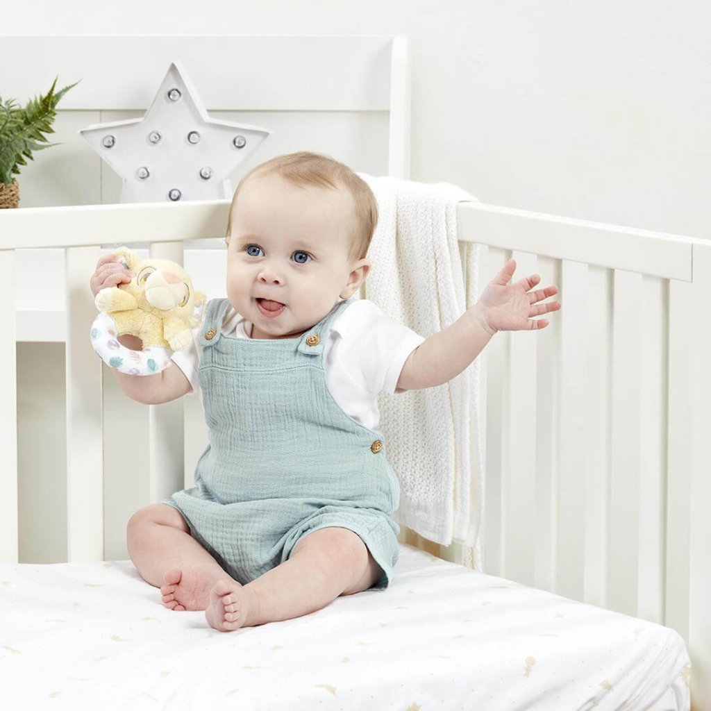 Featuring the loveable lion cub Simba, the Disney Baby Lion King Ring Rattle is made from super soft plush and is the perfect size for little hands to hold. Featuring a pretty nature-inspired pattern, babies will love its gentle rattle sound, as well as Simba's soft paws and ears. This rattle is suitable from birth and makes a great gift for newborns.