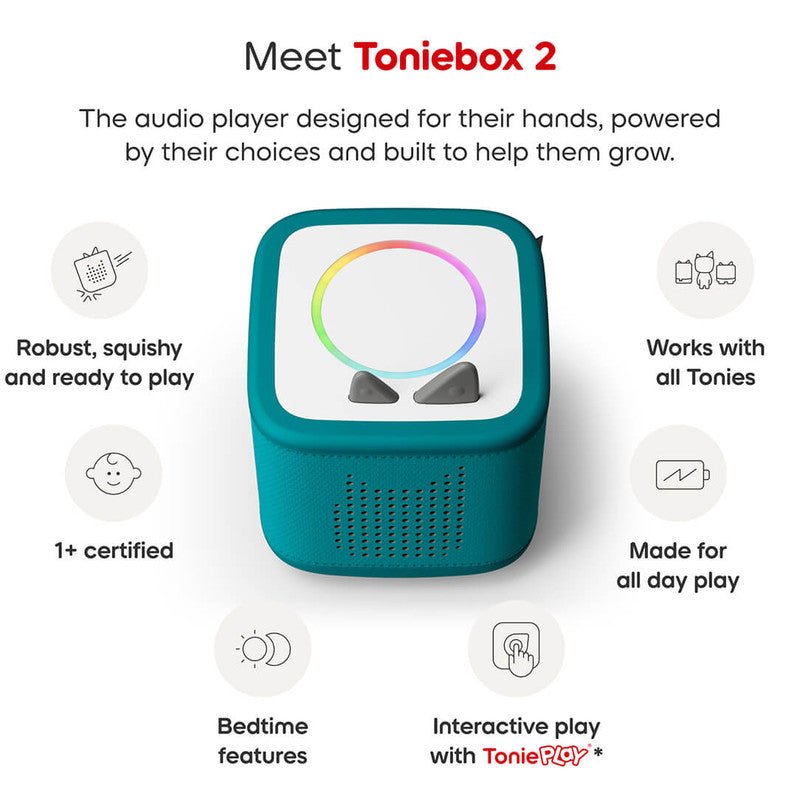 Meet Toniebox 2 - the kid-powered audio player with screen-free stories, songs, games and more. Designed for ages 1-9+, get ready to listen, play and grow in a whole new way.